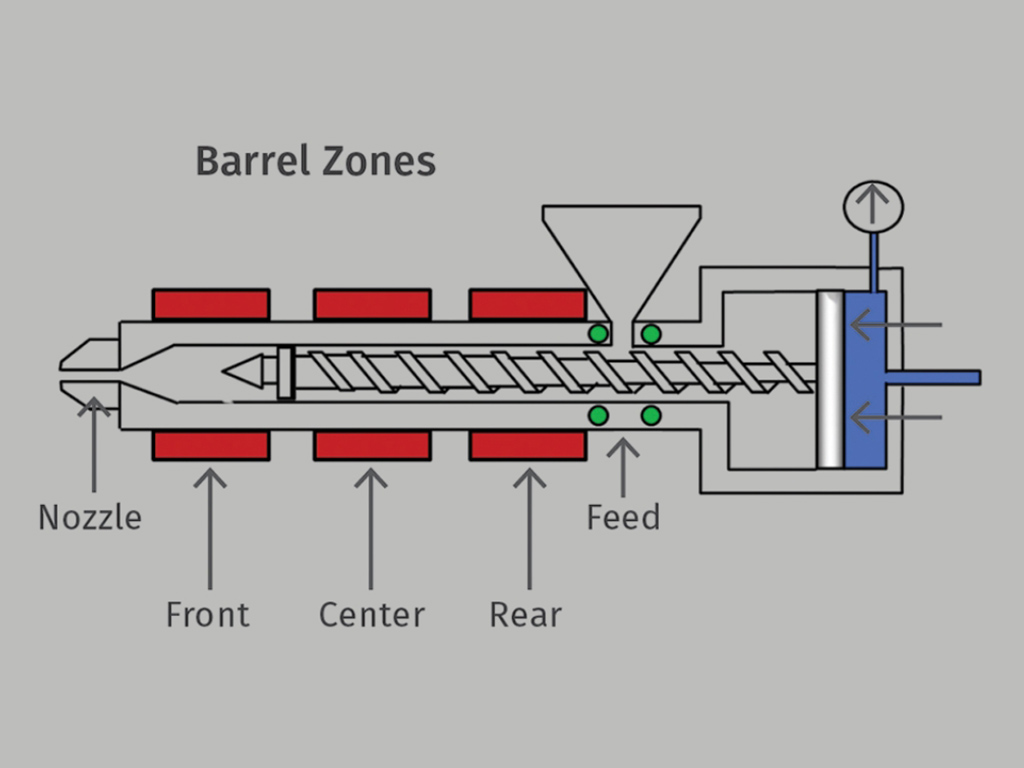 Trục vít vừa có vai trò vận chuyển vừa tạo áp suất để đẩy dòng nhựa chảy đến vòi phun. Giai đoạn này yêu cầu kiểm soát nhiệt độ chính xác theo từng vùng trên trục, để nhựa không bị cháy, biến chất hoặc phân hủy.